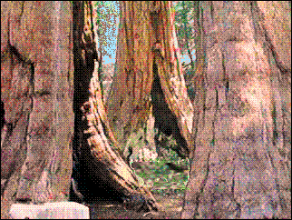 Having taken Grant Tree road from the visitor center in Grant Grove, you soon arrive at the parking lot for the General Grant tree trail. Facing the parking lot is a lovely grove of sequoias that has been given the name "The Happy Family." The name suits this grouping of trees perfectly.