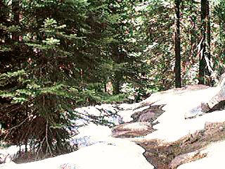 At this elevation snow will remain in spots well into the spring. Here the trail is somewhat obscured by the snow. The fir trees give the area a Christmas like feeling. The snow is not much of an obstacle by May unless there has been a very heavy snow fall the previous winter.